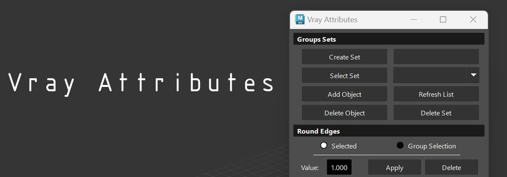 A powerful Python script developed for 3D artists using Autodesk Maya with V-Ray. This tool lets you create and manage Group Sets, apply V-Ray attributes like Round Edges and OpenSubdiv, and quickly generate V-Ray shaders via a clean, production-friendly UI.